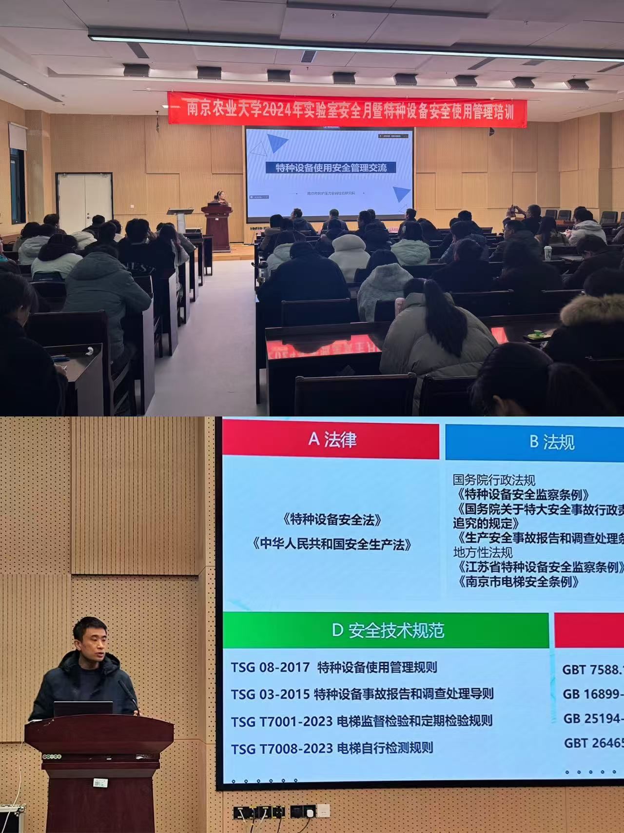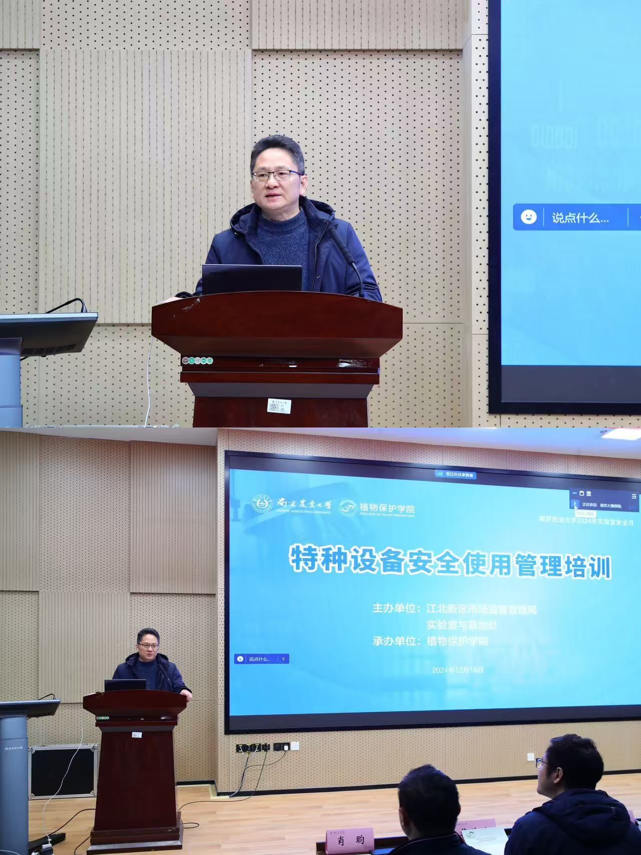 徐立兵代表江北新区市场监督管理局发表讲话,他指出特种设备安全规范管理对于学校和新区的发展都至关重要,要落实安全主体责任,提升管理水平和风险防范意识,为高质量发展筑牢安全防线。随后,南京市锅炉压力容器检验研究院曹明和南京市特种设备安全监督检验研究院肖昀分别就压力容器和电梯等特种设备安全使用管理进行了培训,并深入解读了相关法律法规以及安全标准,指导参会人员如何依法依规落实特种设备管理责任。最后,两位培训老师耐心回答了师生提出的问题,参会人员就培训内容开展了热烈讨论。