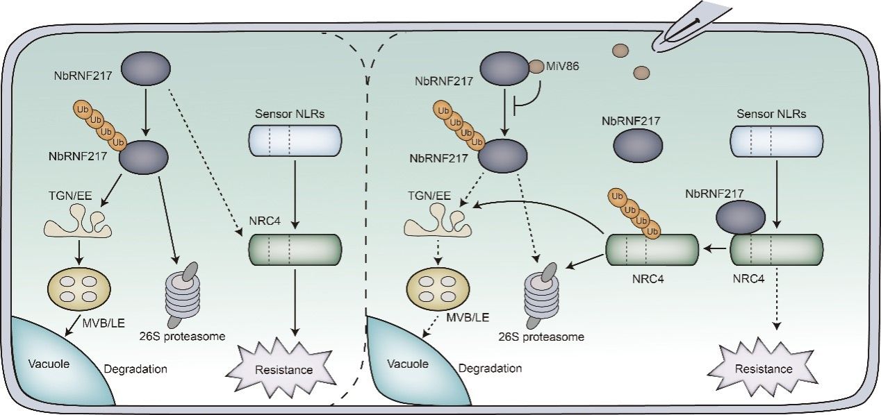 该研究首次发现南方根结线虫(Meloidogyne incognita)能够分泌一类效应蛋白MiV86进入植物细胞, 与植物中的RBR型E3泛素连接酶NbRNF217特异性互作。E3泛素连接酶作为泛素-26S蛋白酶体系统的核心组份,通过泛素化底物蛋白,精密调控真核细胞的多种生理过程。该研究通过转基因过表达和CRISPR-Cas9介导的基因敲除技术,证实NbRNF217是一类感病因子,负调控植物免疫及线虫寄生。进一步利用免疫共沉淀结合质谱联用技术,发现NbRNF217能够靶向植物免疫通路的一类核心NLR受体—NRC4,通过泛素化NRC4促进其经由26S蛋白酶体和内体途径降解。值得注意的是,该研究发现NbRNF217在植物细胞中通过泛素化修饰调控自身的蛋白稳定性,从而避免过渡积累对NRC4造成的降解。而线虫效应蛋白MiV86则能够在不影响NbRNF217酶活的前提下稳定其表达,促进NbRNF217对NRC4的降解。综上所述,该研究系统解析了线虫效应子MiV86通过挟持寄主E3泛素连接酶NbRNF217,利用后者降解植物NLR受体NRC4,从而抑制植物免疫促进线虫寄生的新机制。