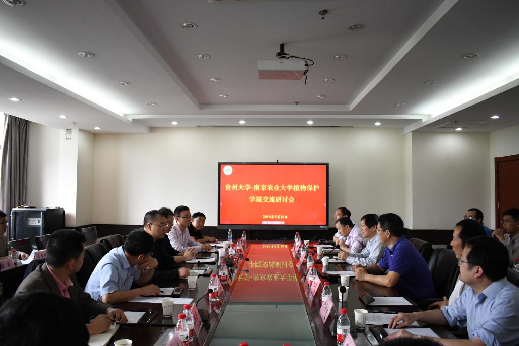 交流考察表示欢迎,介绍了植保院的基本情况,并就学科建设、师资引进、人才培养、国际交流合作等方面进行了工作经验分享。杨松院长介绍了贵州大学的历史沿革、学科发展和教学科研的基本情况,并表示希望通过此次交流,为今后的学科建设、人才培养提供借鉴和参考。随后,双方就植物保护学科和学位授权点建设、学位点合格评估要素、生源质量、制度保障、课程体系等方面进行了深入交流,同时国务院学位委员会植物保护学科评议组成员韩召军老师就教育部学位点评估要素和人才培养方案课程体系改革进行了详细解读。