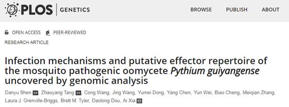 4月27日,该研究成果以“Infection mechanisms and putative effector repertoire of the mosquito pathogenic oomycetePythium guiyangense uncovered by genomic analysis”为题在国际知名学术期刊《PLoS Genetics》上发表。植保学院科研实验中心的沈丹宇博士和博士生唐朝阳为论文共同第一作者,夏爱副教授为通讯作者,此外瑞典农业科技大学Laura Grenville-Briggs教授和窦道龙教授也参与了此工作。该研究得到了国家自然科学基金委的资助。