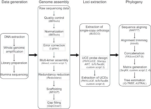昆虫分类团队在国际著名生态与进化学术期刊Methods in Ecology and Evolution(影响因子6.363,五年影响因子9.881)在线发表了题为“Phylogenomics from Low‐coverage Whole‐genome Sequencing”的研究论文。该研究提出了一种新的基于全基因组鸟枪测序法(WGS)的分析流程,可以从低深度测序的基因组数据中快速从头组装基因组,并使用一系列高效的生物信息学工具来提取常用的系统发育基因组分子标记。H小说