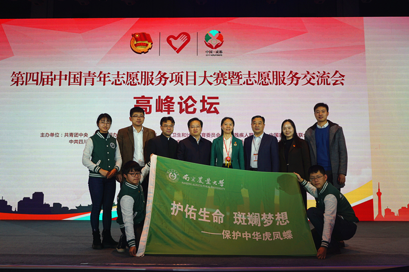 “护佑生命 斑斓梦想”保护中华虎凤蝶项目在校团委副书记谭智赟带队下代表学校参赛,获共青团中央书记处书记尹冬梅、江苏团省委书记司勇的认可与鼓励,最终荣获全国青年志愿服务示范项目创建提名奖,并作为代表项目上台领奖。