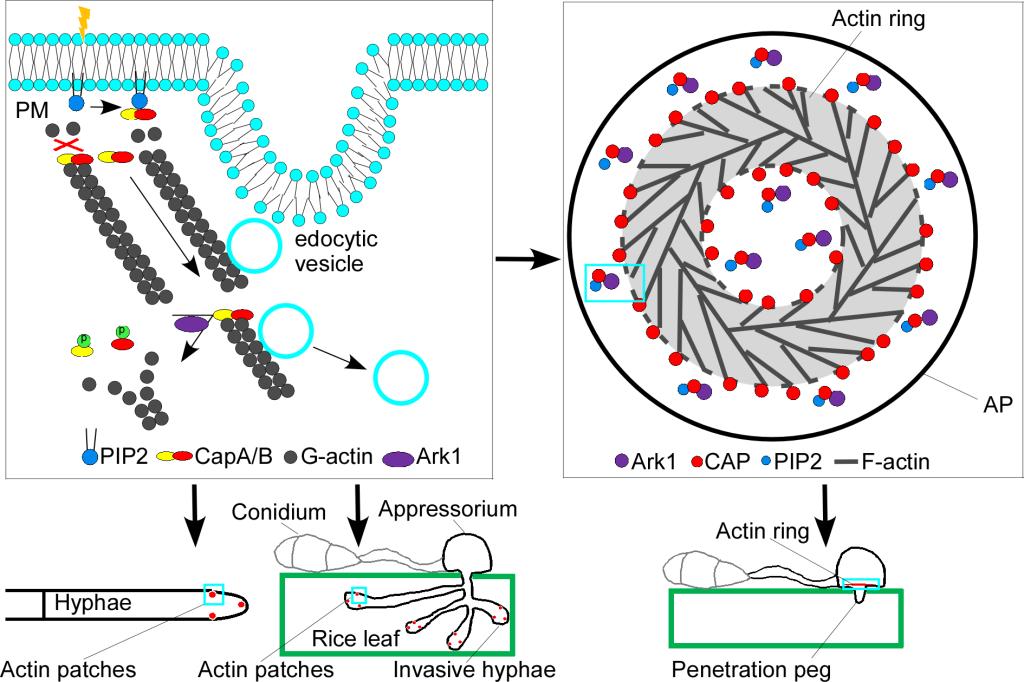 该研究发现稻瘟病菌的肌动蛋白加帽蛋白复合体MoCAP(MoCapA/B)协调内吞和肌动蛋白的动态组装控制病菌的孢子形成、侵染菌丝的扩展及致病力,进一步发现肌动蛋白调控激酶MoArk1对MoCapA蛋白第85位的丝氨酸和MoCapB蛋白的第285位的丝氨酸进行磷酸化修饰,进而负调控MoCapA和MoCapB的生物学功能,同时证实细胞膜上PIP2结合MoCapA和MoCapB调控附着胞阶段的肌动蛋白的动态组装,控制附着胞的侵入寄主的能力。该研究通过对稻瘟病菌侵入水稻及其在水稻细胞内扩展机制的解析,拓展了人们对稻瘟病菌致病分子机制的认识,同时对防治稻瘟病新型药剂的开发具有重要参考价值。