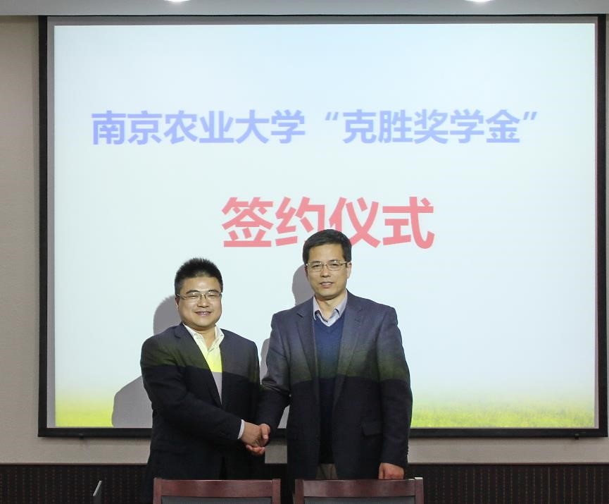 共同设立“克胜奖学金”。植保学院书记吴益东主持签字仪式,江苏克胜集团股份有限公司总经理、中农网购(江苏)电子商务有限公司董事长吴成伟、副校长丁艳锋、产学研合作处处长马海田、植保院书记吴益东、植保院院长王源超等参加了签约仪式。