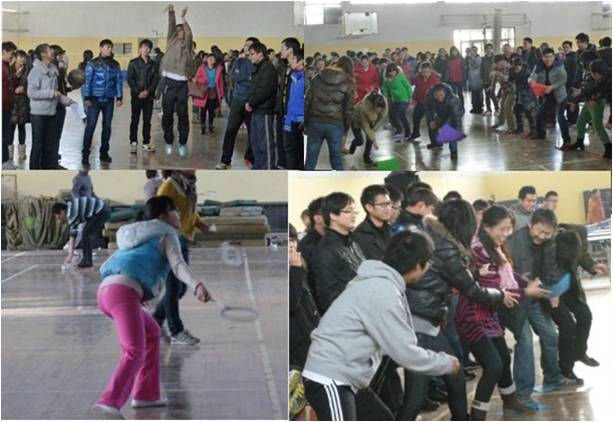 “首届迎新年师生联谊会”。本届联谊会的比赛项目兼趣味性与竞技性,涵盖了传统的羽毛球与乒乓球单打的个人项目和拔河比赛的集体项目,也不乏“定点投篮”、“摸石过河”、“赶猪过河”类型的趣味性集体项目,此次活动受到了广大师生的好评。