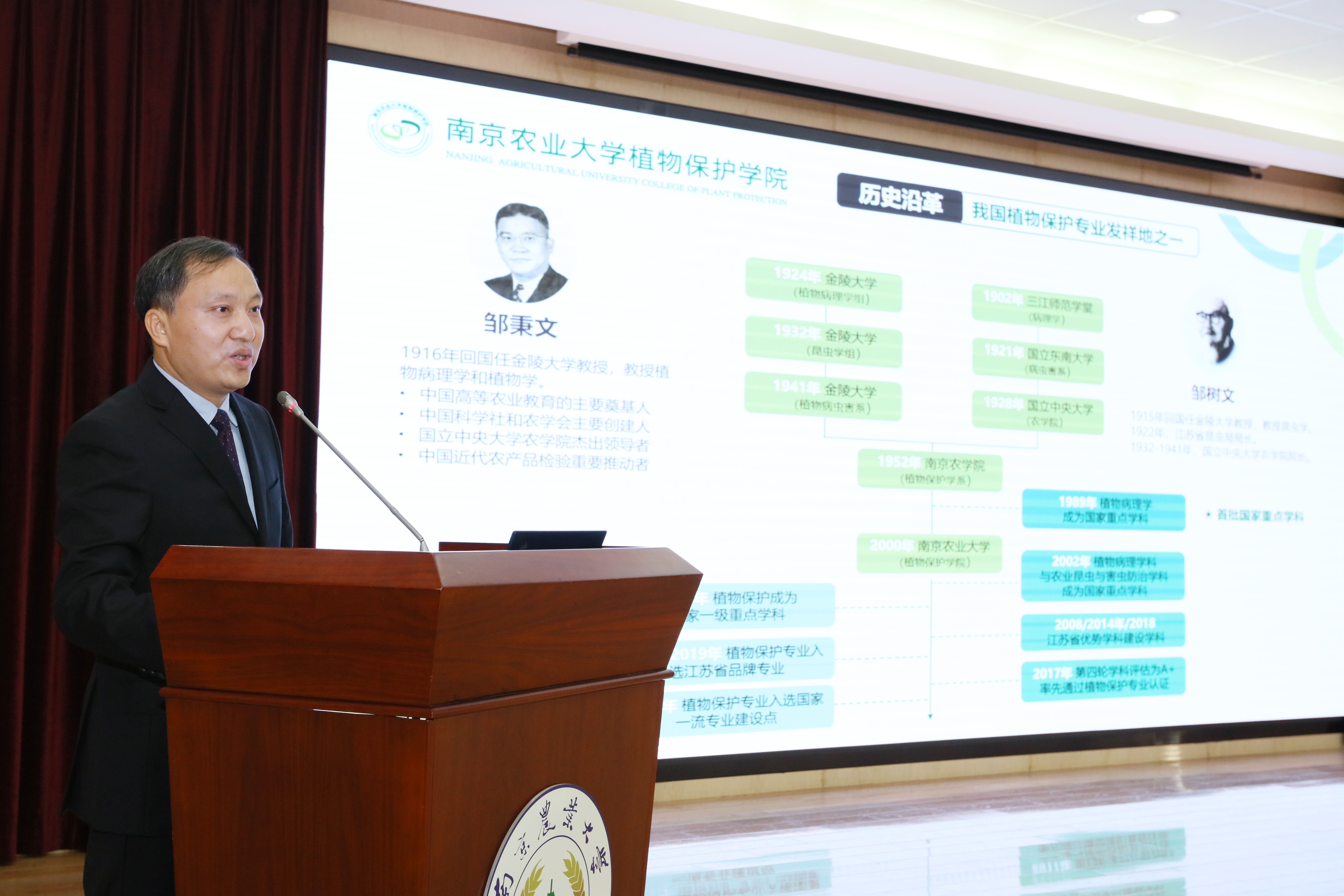 胡锋致欢迎辞,他代表学校向参加庆典仪式的领导、来宾和校友表示欢迎,他介绍了学校办学概况、植保学科历史底蕴及发展情况,提出两点希望:一是希望H小说