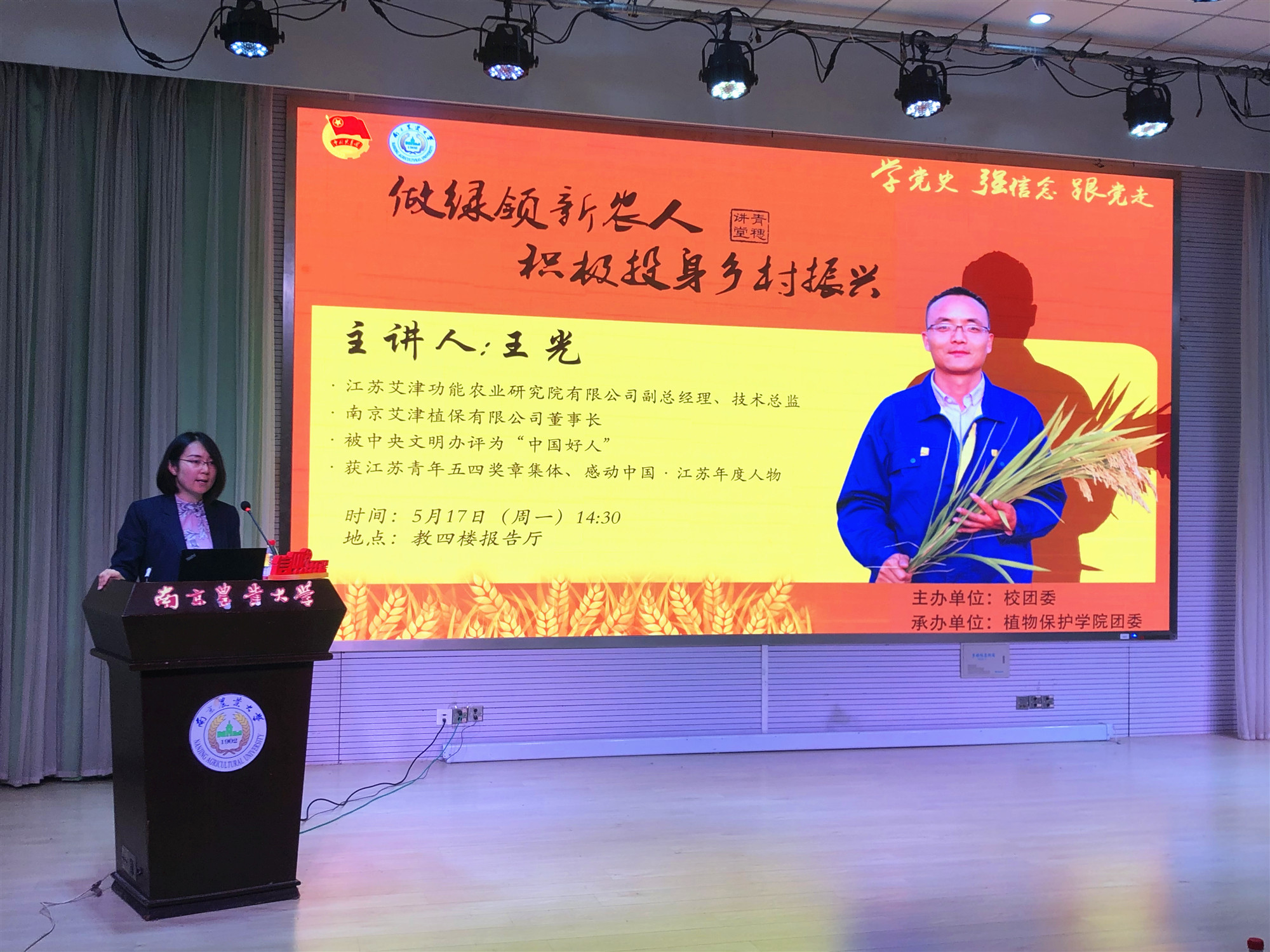 5月17日下午,江苏艾津功能农业研究院有限公司副总经理、技术总监,南京艾津植保有限公司董事长王光做客我校第40期青穗讲堂,带来以“做绿领新农人,积极投身乡村振兴”为主题的分享。本次活动由校团委主办,H小说