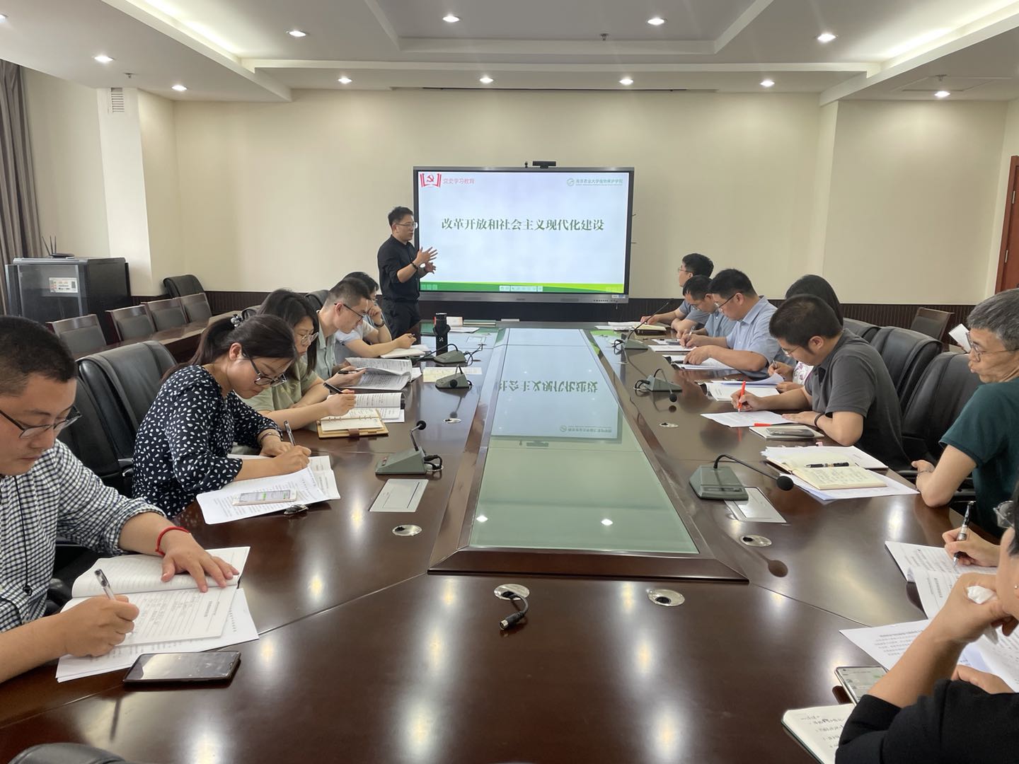 党委副书记吴智丹带领大家集体学习《中国共产党普通高等学校基层组织工作条例》,重点学习第三章高校院(系)级党组织职能,教工党支部和学生党支部的主要职能。