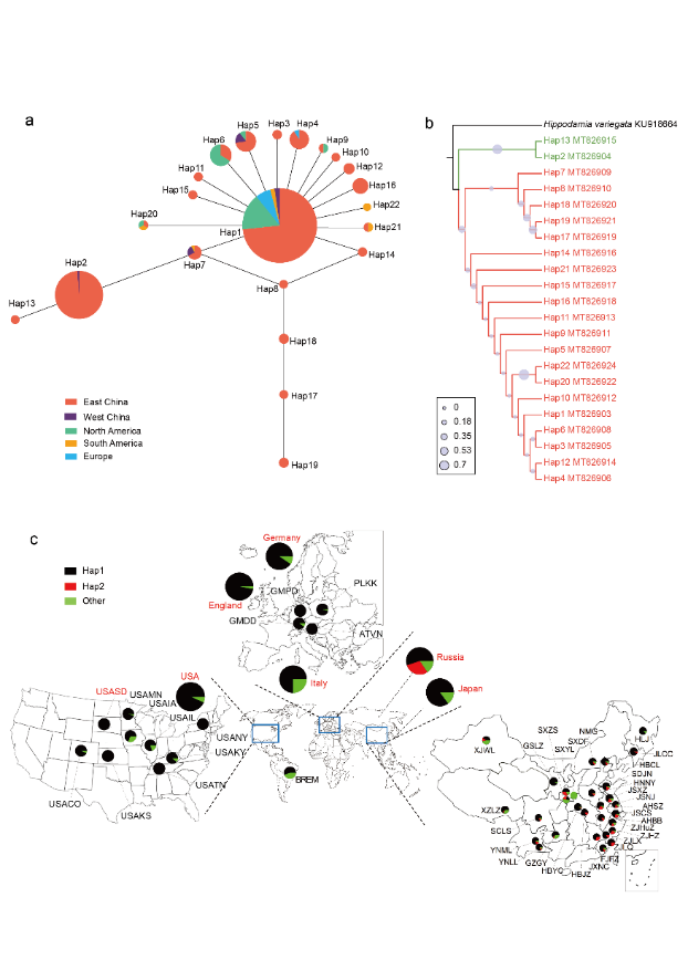 图1. 异色瓢虫mtCOI单倍型的系统发育关系及全球分布范围