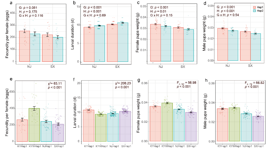 本研究对采自中国、欧洲、南、北美洲的29个地理种群样本开展了线粒体与核基因组测序分析,深入解析了异色瓢虫的全球种群遗传结构,获得如下主要发现。(1)中国东部种群可能是非本地种群的主要入侵来源,欧洲种群是中国东部和美洲种群的混合群体;(2)通过群体自然选择分析发现一些与适应性相关的候选基因位点,这些基因位点主要涉及体色变异、视觉感知和血淋巴合成等;(3)进化历史估计的分析结果表明,异色瓢虫在本地和非本地范围内存在不同规模的不对称迁移(4);(4)明确了其在中国本土范围内的起源和扩散路线;(5)发现两种线粒体单倍型(Hap1和Hap2)在本土地区占主导地位,但在非本土地区Hap1是唯一的优势单倍型(图1),Hap1在一些生活史特征上优于Hap2(图2)。综上,该研究为异色瓢虫从原产地向其他大陆的成功入侵提出了新见解。
