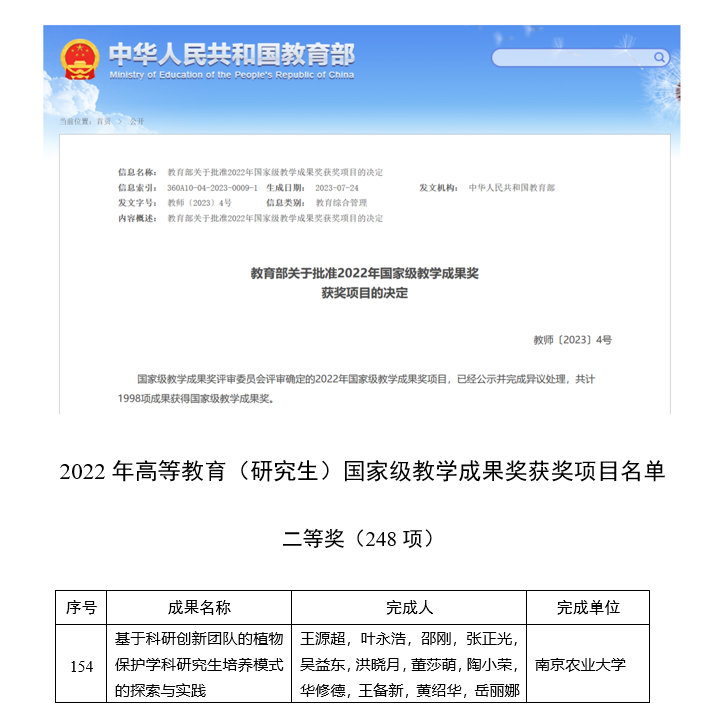 王源超教授等申报的“基于科研创新团队的植物保护学科研究生培养模式的探索与实践”荣获2022年高等教育(研究生)国家级教学成果奖二等奖。