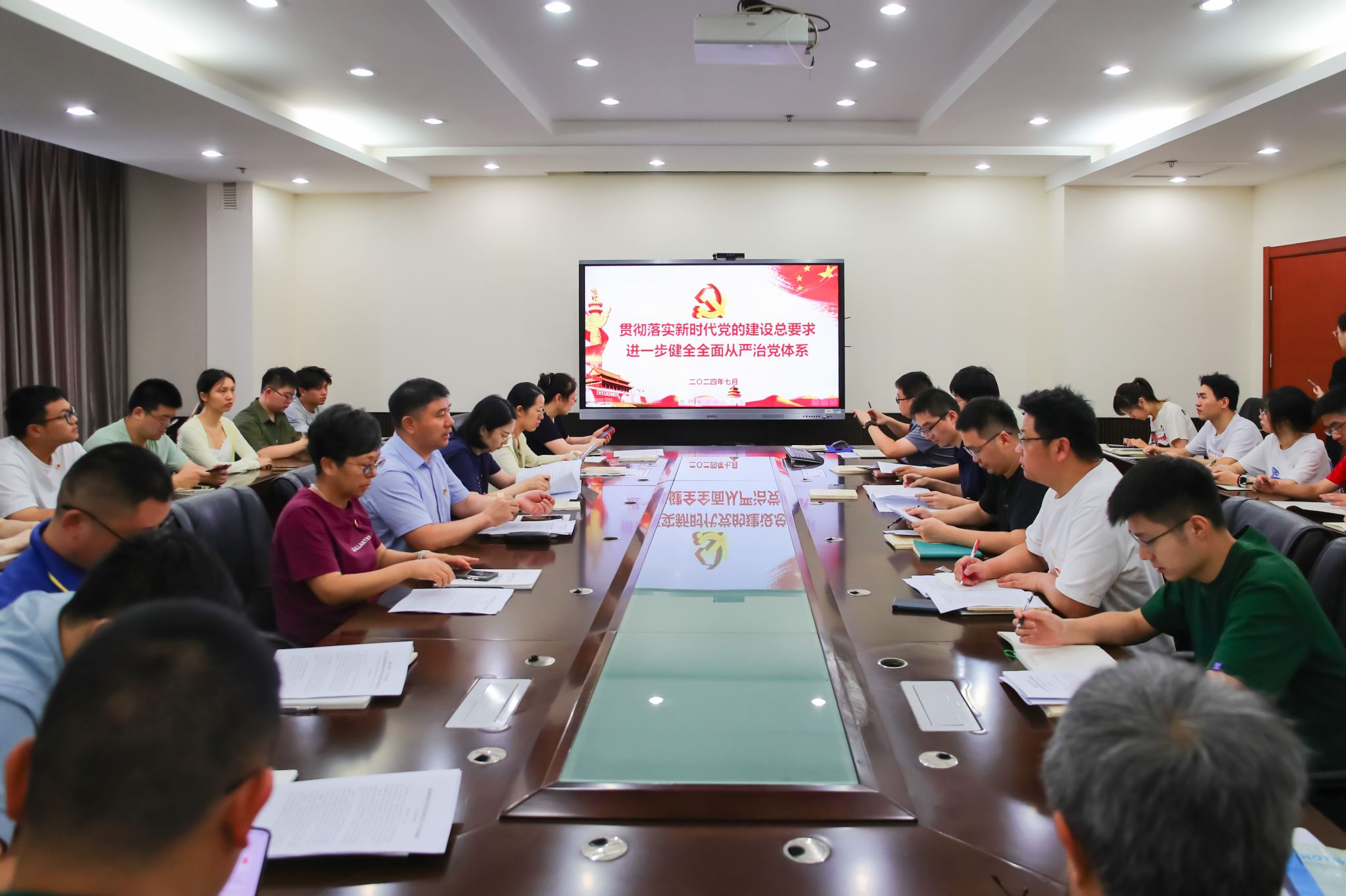 许承保首先为大家梳理了党的十八大以来中央政治局在“七一”前夕集体学习的基本情况,通过梳理发现,中央政治局在“七一”前夕进行集体学习几乎成为惯例,而且每次学习的主题都与党的建设有关。随后他向大家解读了新时代党的建设总要求、新时代党的组织路线、党的自我革命重要思想等,带领大家认真学习了习近平总书记在二十届中共中央政治局进行第十五次集体学习上的重要讲话精神。他指出,党的十八大以来,以习近平同志为核心的党中央坚定不移推进全面从严治党,构建起全面从严治党体系,开辟了百年大党自我革命新境界。为不断把新时代党的建设新的伟大工程推向前进,党的二十大首次提出“健全全面从严治党体系”的重大举措,在深刻分析新征程上党面临的风险挑战的基础上,这次中央政治局集体学习又明确提出“进一步健全全面从严治党体系”,充分体现了以习近平同志为核心的党中央与时俱进管党治党的系统思维、科学方法。