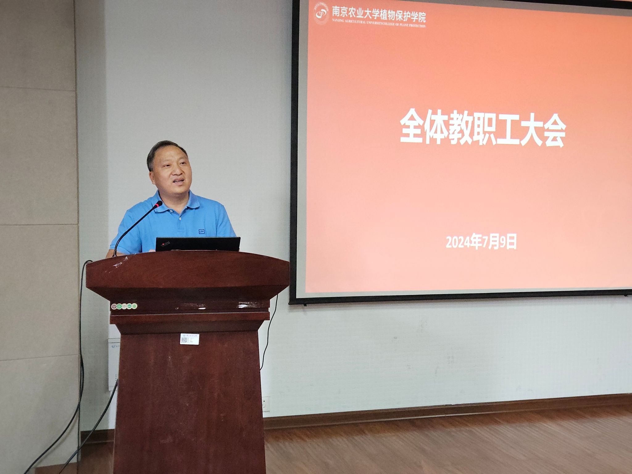 在理科楼C303会议室召开全院教职工大会,学院领导班子及全院教职工参加会议,会议由学院党委书记许承保主持。