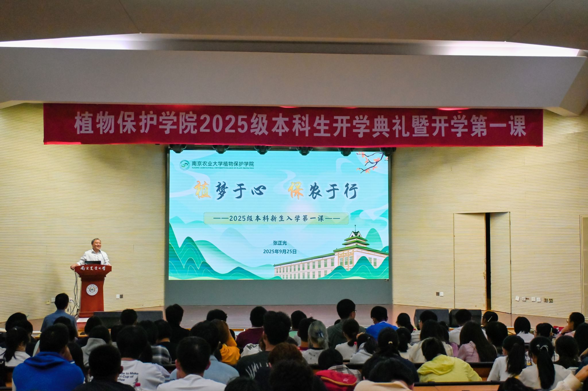 党委书记张正光作《植梦于心 保农于行》主题报告。他从“责任重大—你的专业关乎人类饭碗”、“底蕴深厚—你的专业遥遥领先”等几个方面,向新生介绍了南农植保专业的重要地位和领先水平。最后,他表达了对新生最殷切的祝愿:“愿你们在南农的四年里,成为有家国情怀、有科学家精神、有全球视野的拔尖创新型植保人才!”