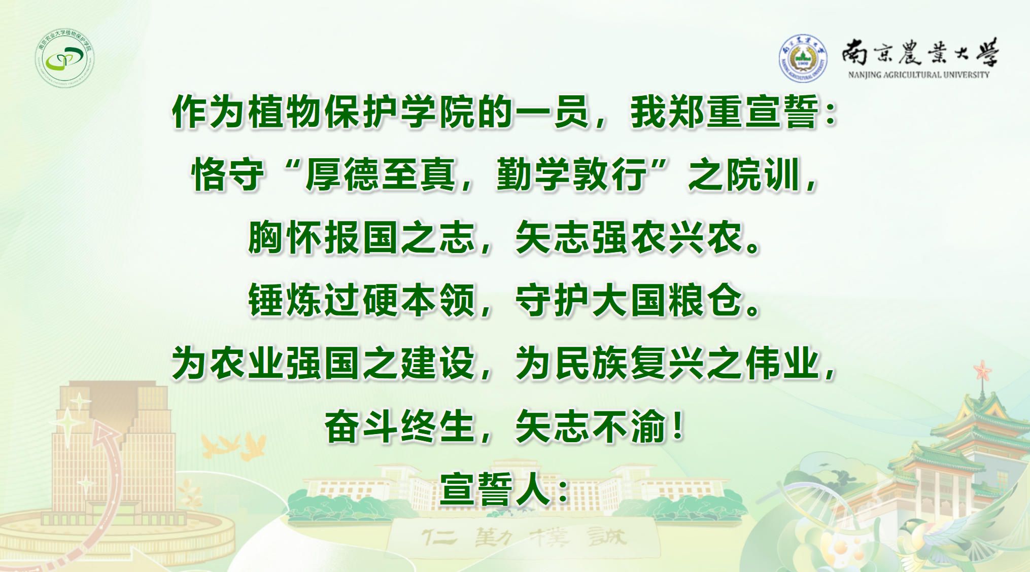 身处人生的崭新阶段,愿每一位“植保新人”胸怀强农大志、躬行求索真知、接续强国薪火,在南农的广袤天地中燃出自己的光彩,肩负强农使命,贡献青春力量!