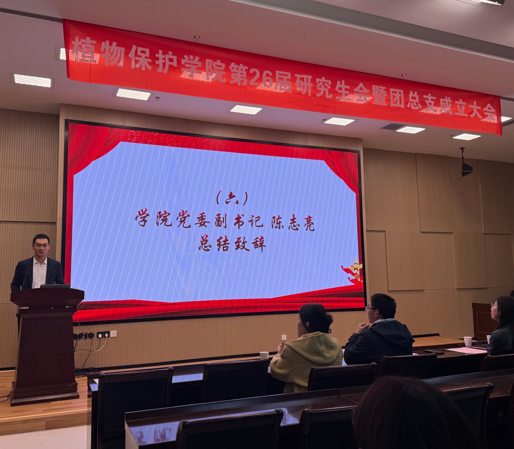 最后,陈志亮为大会总结致辞。他对校研会的关心指导表示感谢,对上一届院研会取得的成绩表示了肯定,对新一届研会干部和班干部提出了殷切期望,希望大家始终把思想引领作为首要任务,发挥桥梁纽带作用,做学院师生的服务者,主动加强与学院老师的沟通对接,及时解决师生诉求,为学院发展建设贡献青春力量。