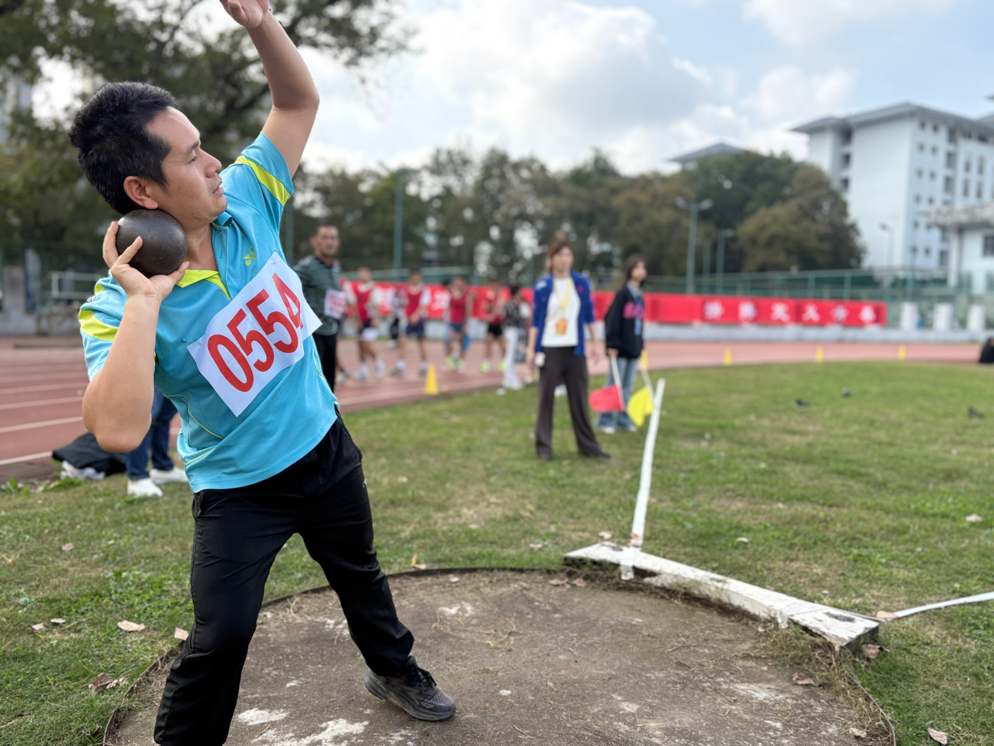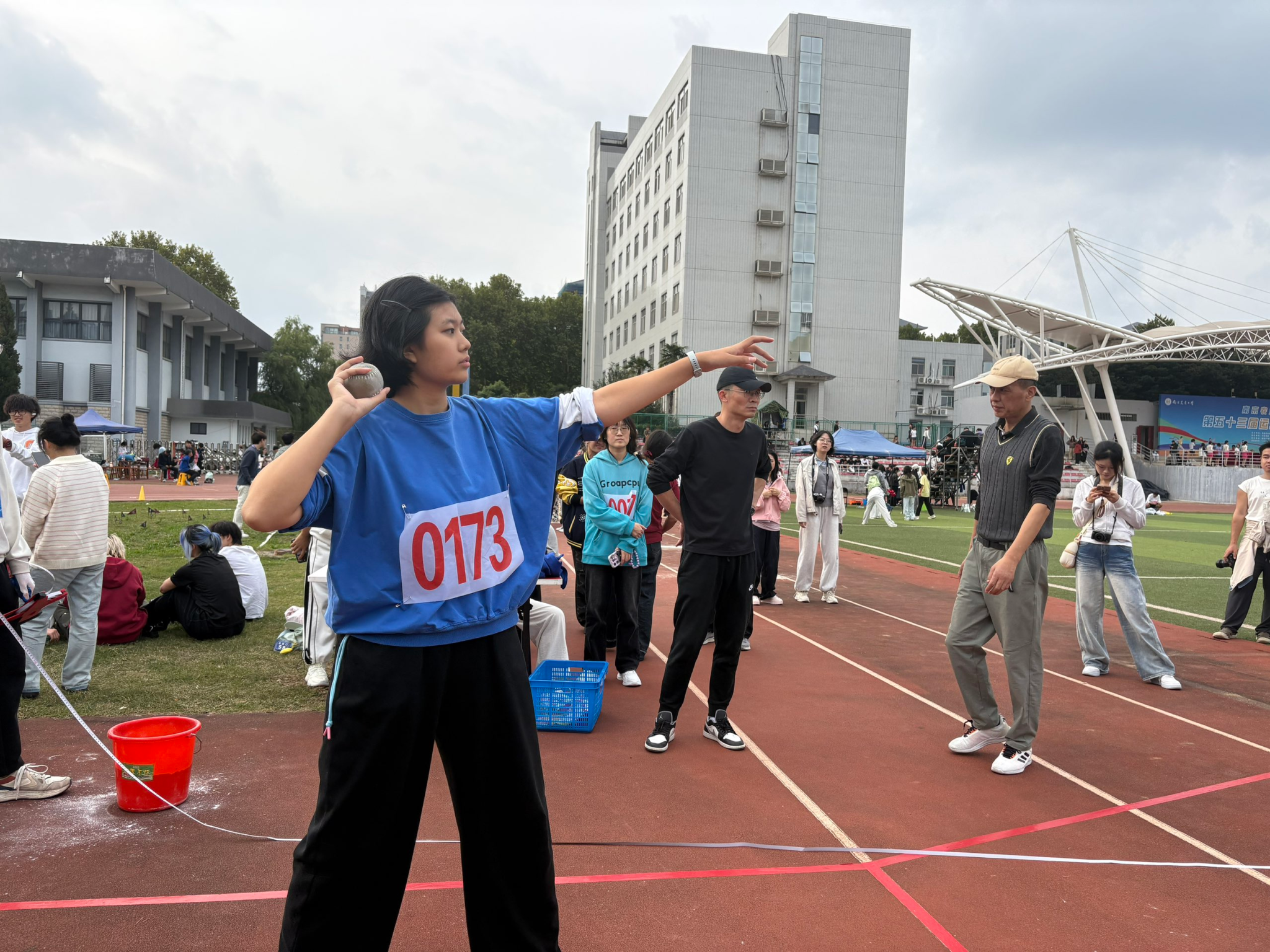 铅球、实心球赛场,选手们鼓足干劲,将沉重的球奋力抛出,在空中划出一道道优美的弧线。