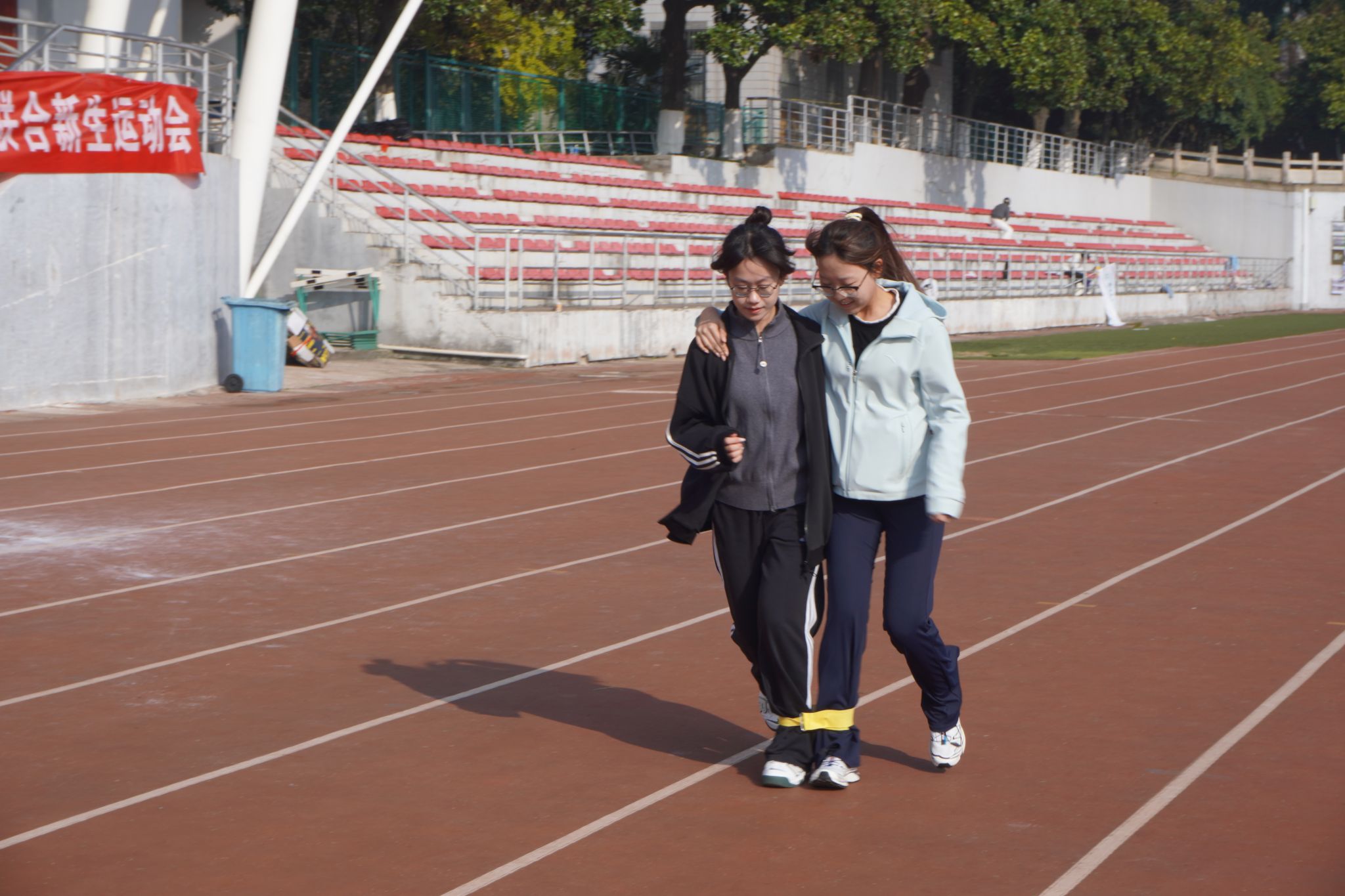 在两人三足中,经过前半程的磨合,参赛者们略显疲惫,但步伐一致,节奏统一地迈向终点。