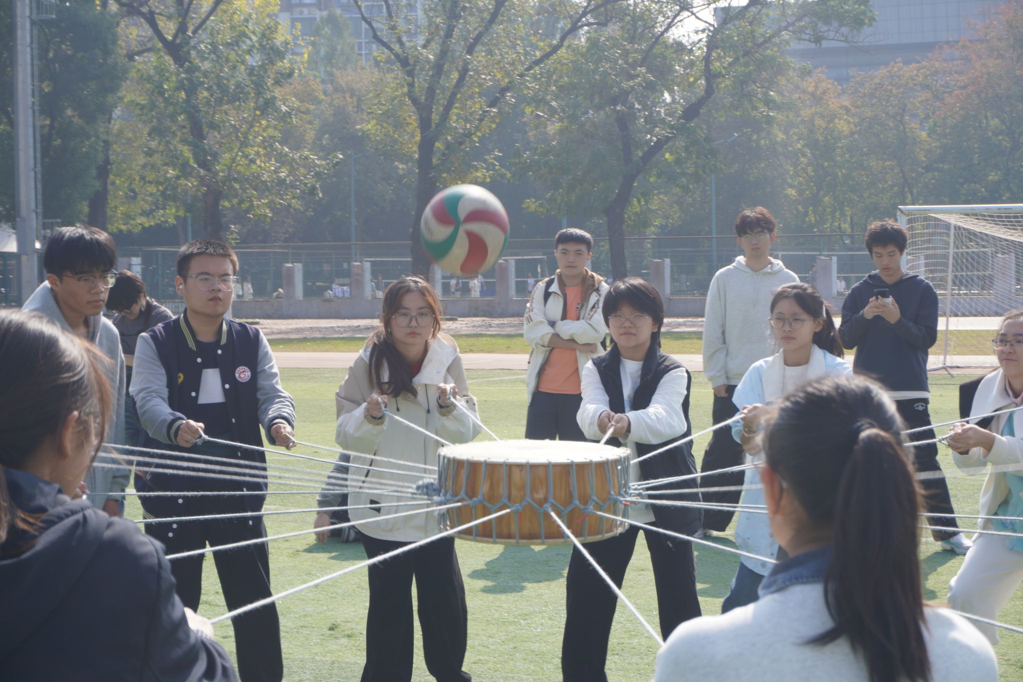 在同心鼓垫球游戏中,多次垫球后精神高度集中,参赛者们微调绳索,共同追寻着最佳的击球节奏,团队的迁就与磨合更是在排球一次次高高垫起时展现。
