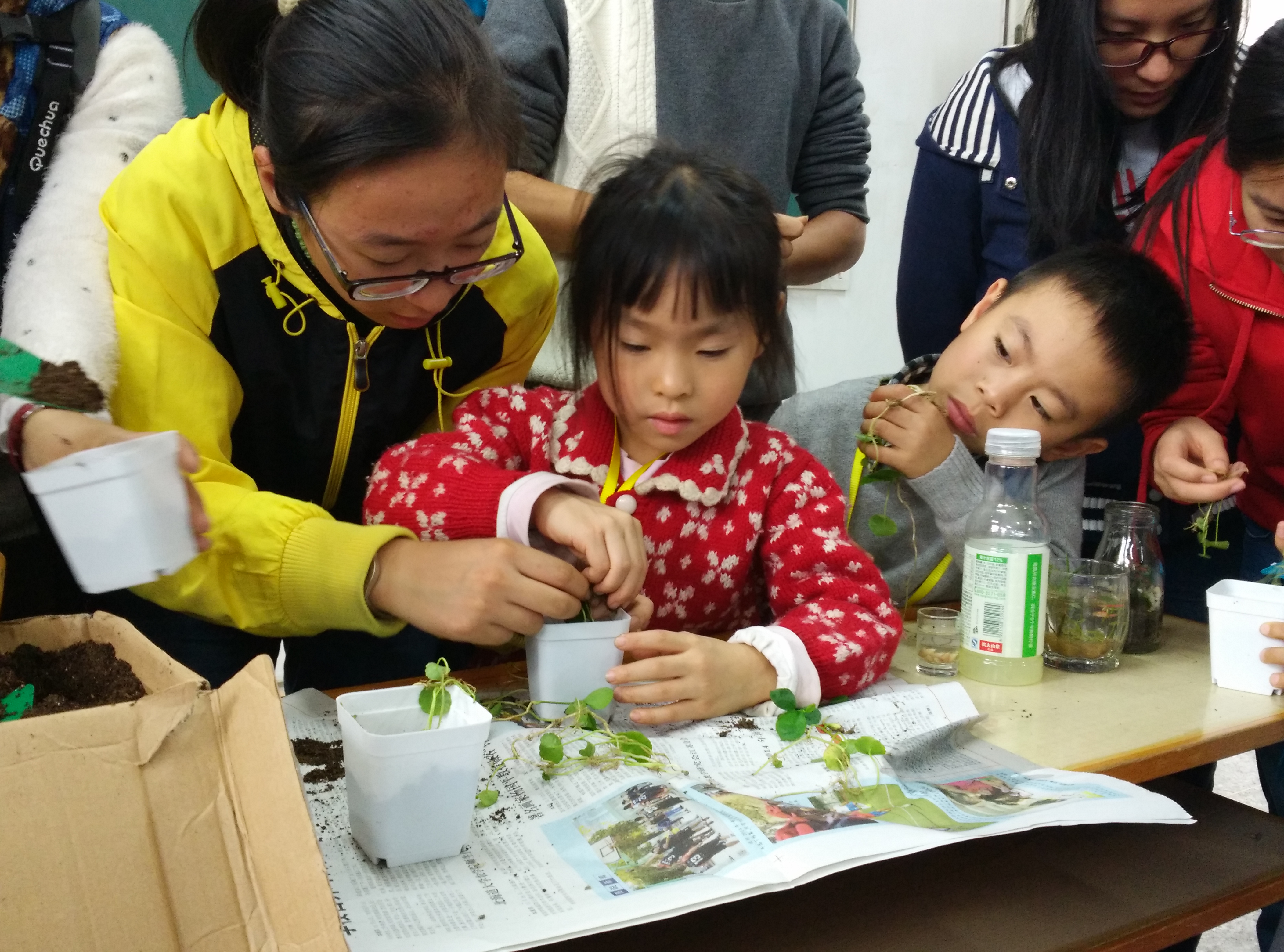 在教学楼A104,带队老师向参观者示范了植物移栽的整个过程,在家长和老师的协助下,小朋友们亲自种植了铜钱草和薄荷,了解了关于移栽的知识。之后,志愿者带领大家参观了美丽的南农校园,并在主楼前合影留念。至此,“校园行,南农站”活动圆满结束。