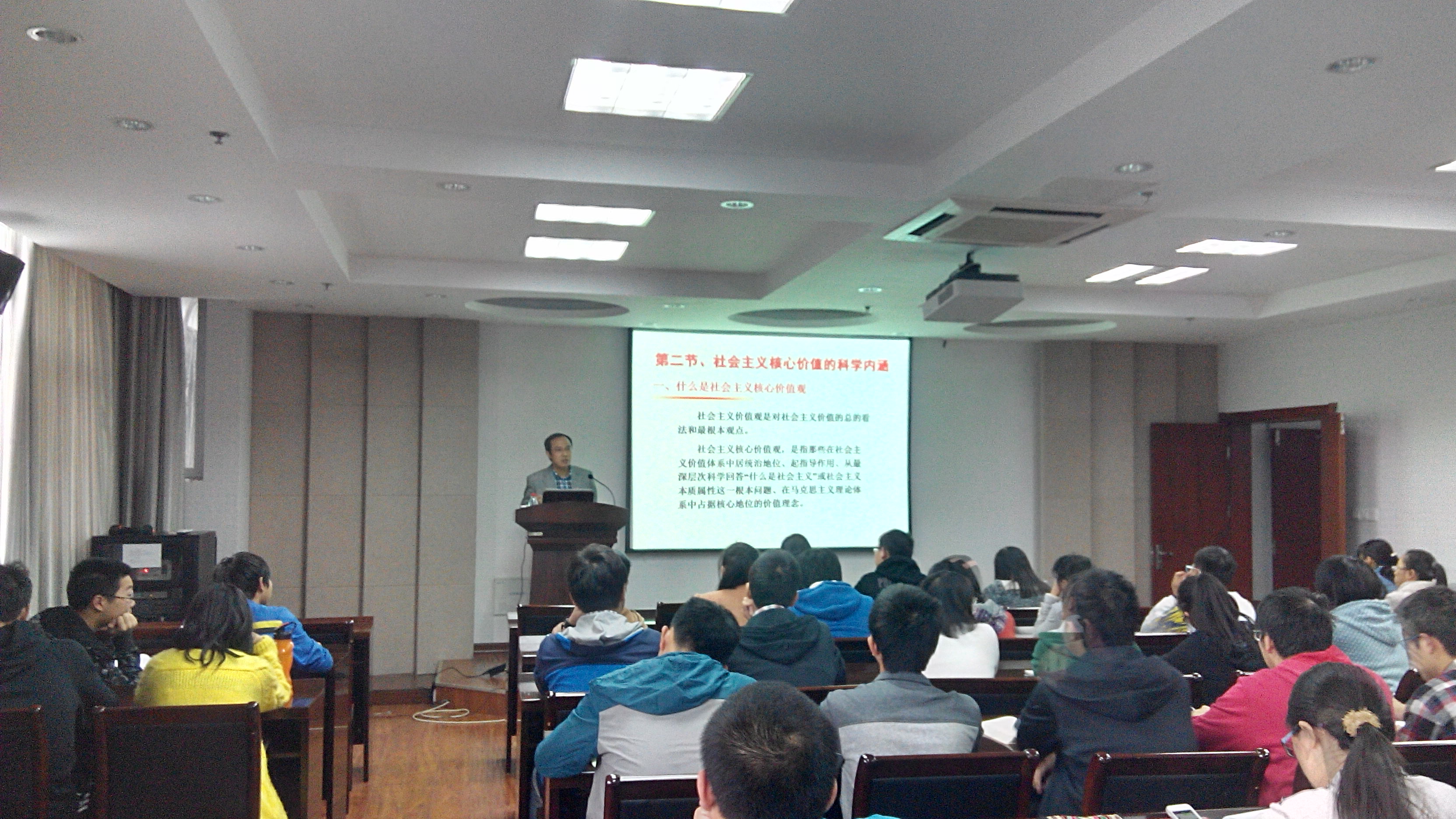 吴书记将社会主义核心价值观的科学内涵分三个方面展开详细讲解,阐述了从国家层面需要倡导“富强、民主、文明、和谐”的价值目标;从社会层面应当倡导“自由、平等、公正、法治”的价值准则;从个人层面提出倡导爱国、敬业、诚信、友善。针对当代大学生正处于价值观形成阶段,吴书记提出社会主义核心价值观的培育有着重要意义。吴书记利用八荣八耻向同学们讲述了关于社会主义荣辱观的知识,激励同学们形成正确的价值导向,树立良好的道德风气。