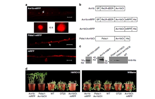 文章解析了大豆疫霉菌和棉花黄萎菌的一个保守毒性蛋白的功能与其运出机制。大豆疫霉为卵菌,它引起的大豆根腐病是国际大豆生产上的最主要病害之一,同时该菌还是研究卵菌病害控制的重要材料;黄萎菌造成棉花黄萎病,该病目前是国内棉花生产的最主要限制性因素。文章报道这两种不同类型的病原菌都能产生一类毒性蛋白,在侵染过程中它们进入植物细胞,作为水解酶分解植物抗病信号物质水杨酸的前体,使得植物细胞不能积累这个重要信使,终止其介导的抗病反应从而使植物更为感病。重要的是,论文发现该毒性蛋白与已知病原菌毒性蛋白运出机制不同,为非典型性分泌,说明在病原菌与寄主的互动过程中,病原菌除了利用熟知的分泌途径产生毒性蛋白在“正面战场”中挑起“战火”,还能利用“暗度陈仓”的策略向“敌后方”运送“间谍”分子,以此来干扰植物的正常抗病反应过程。该研究对于了解植物病原菌的致病成灾机制,鉴定有效药物靶标和开发作物抗病材料具有理论和指导意义。