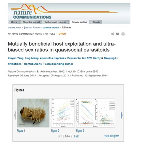 李保平教授团队长期从事害虫生物防治和寄生蜂社会行为方面的研究,进行了大量细致入微的观察和实验,首次在寄生蜂中发现了支持“局部资源强化理论”的证据。论文第一作者为在读博士研究生唐秀云,通信作者为李保平教授。