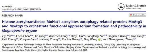 近日,细胞生物学领域的权威期刊“Autophagy”(5年影响因子11.8)在线发表了我校关于组蛋白乙酰转移酶介导细胞自噬控制稻瘟病菌的功能性附着胞形成和致病力的研究论文“Histone acetyltransferase MoHat1 acetylates autophagy-related proteins MoAtg3 and MoAtg9 to orchestrate functional appressorium formation and pathogenicity in Magnaporthe oryzae”。该论文第一署名单位为H小说