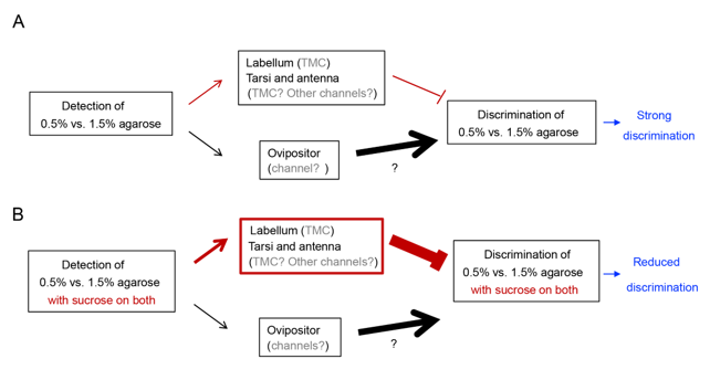 蚊子喜欢将卵产在柔软的水面上,蝗虫喜欢产卵于松软的土壤中,寄生蜂将卵宝宝产在其它寄主昆虫中,果蝇则喜欢将卵产在香甜的水果中。然而昆虫是如何选择产卵位点的?昆虫妈妈又是如何去感知产卵基质的硬度、甜度等,并进而整合各个感觉信息给宝宝找一个安全生长的家呢?