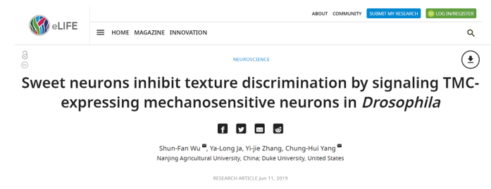 研究论文“Sweet neurons inhibit texture discrimination by signaling TMC-expressing mechanosensitive neurons in Drosophila”于2019年6月11日以长文形式出版在eLife杂志。吴顺凡博士是论文的第一作者和共同通讯作者,杜克大学Yang Chung-Hui博士是论文的共同通讯作者,植保院硕士生贾亚龙和博士生张伊杰也参与了部分工作,H小说